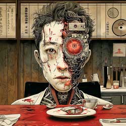 Desechó el intestino grueso, puso el intestino delgado en un guiso con verduras, y usó el duodeno para hacer salchichas. Reemplazó el hígado y los riñones con órganos artificiales, salteó los originales y se los comió. Guardó el estómago para después, conservado sumergido en fluidos nutritivos dentro de un contenedor de plástico.